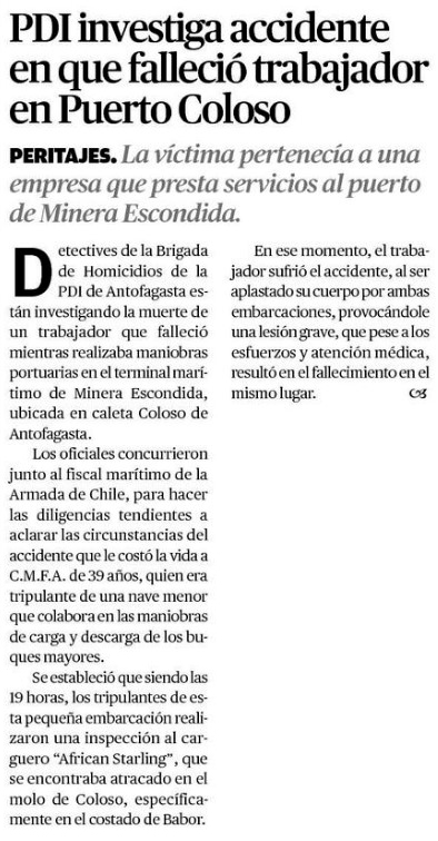 Trabajador perdió la vida tras accidentarse en Puerto Coloso - (Estrella de Antofagasta)