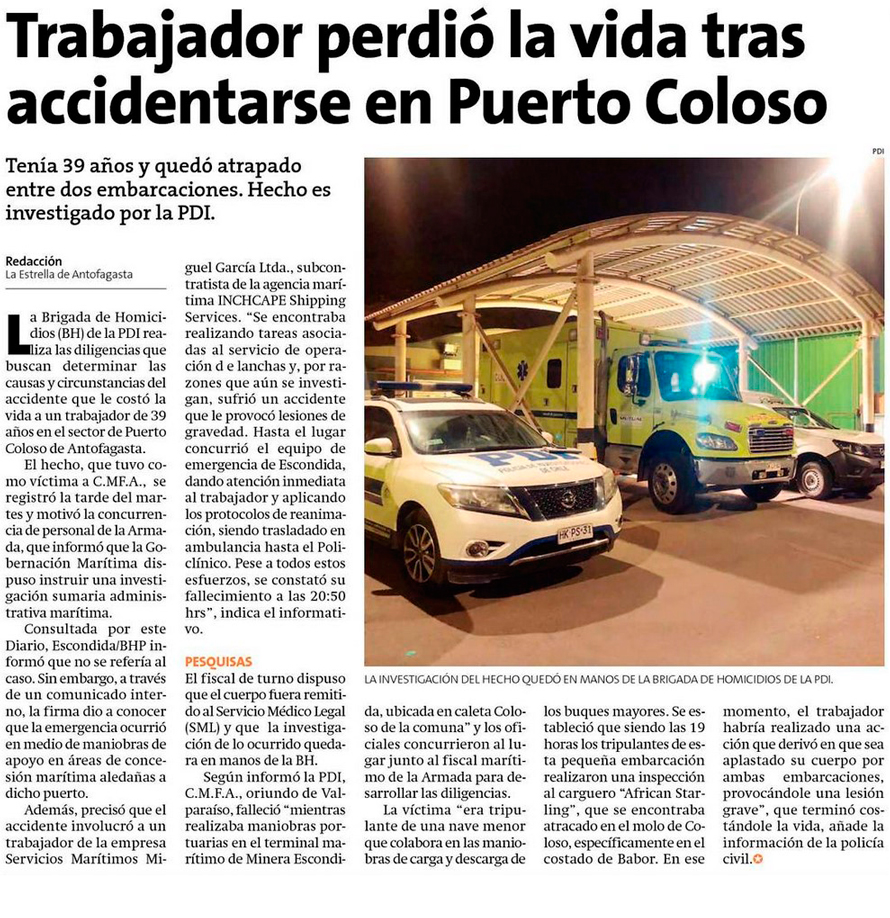 PDI investiga accidente en que falleció trabajador en Puerto Coloso - (El Mercurio de Antofagasta)