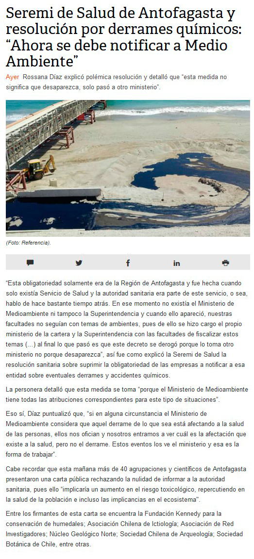 Seremi de Salud dice que información de derrames ahora es responsabilidad de Medioambiente - (El Mercurio de Antofagasta)