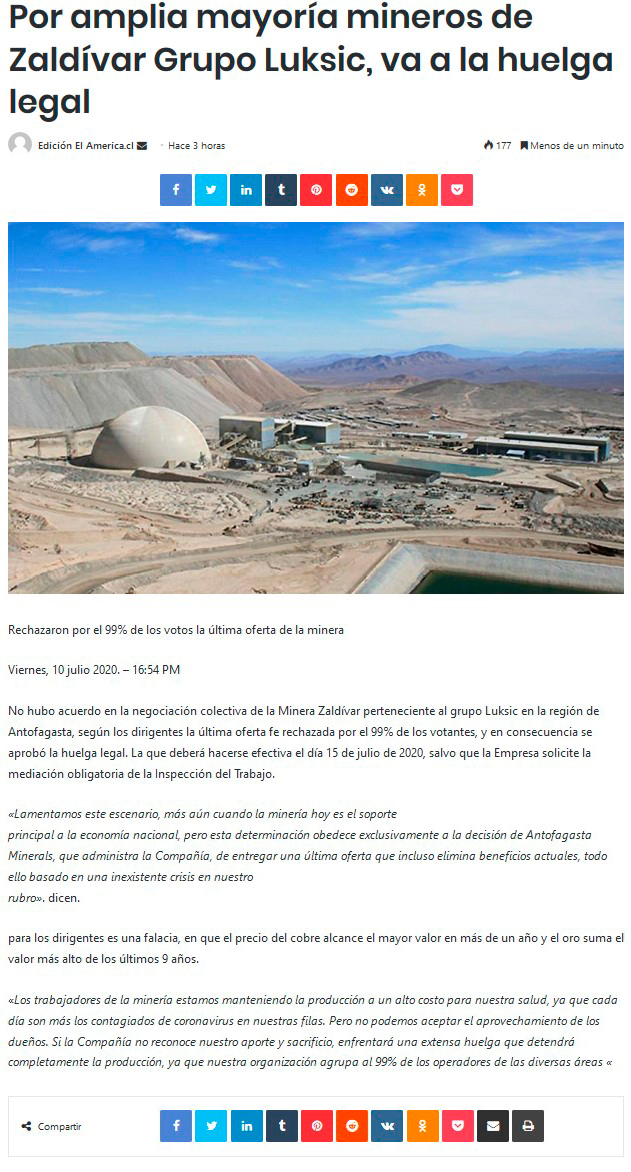 Sindicato N°1 de Minera Zaldívar iniciaría huelga legal a partir del 15 de julio - (El Mercurio de Antofagasta)