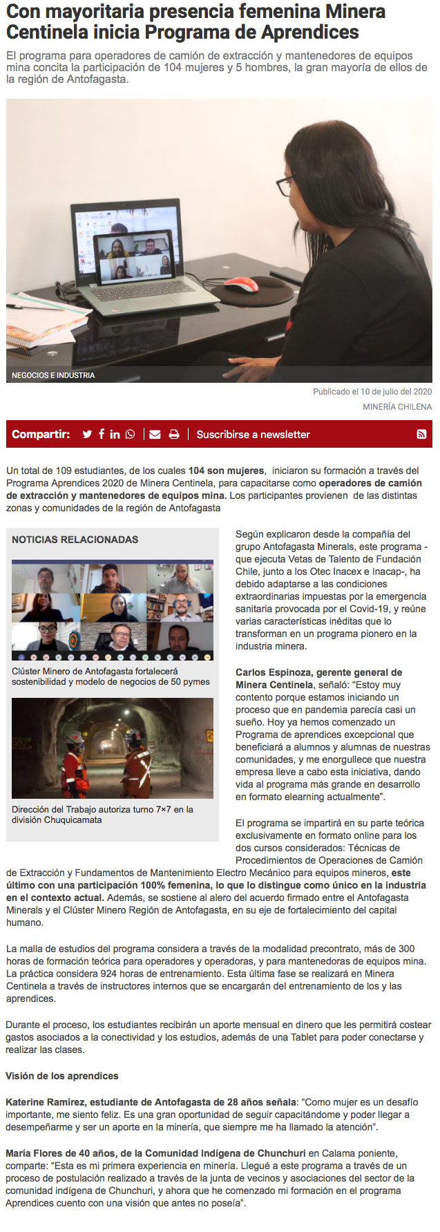 Minera Centinela inicia Programa de Aprendices para operadores de camión de extracción y mantenedores de equipos mina - (timeline)
