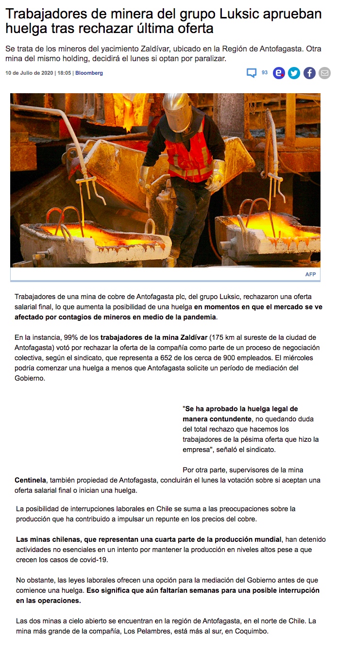 Trabajadores de mina Zaldívar controlada por Antofagasta Minerals aprueban huelga: empresa buscará mediación - (El Mostrador)