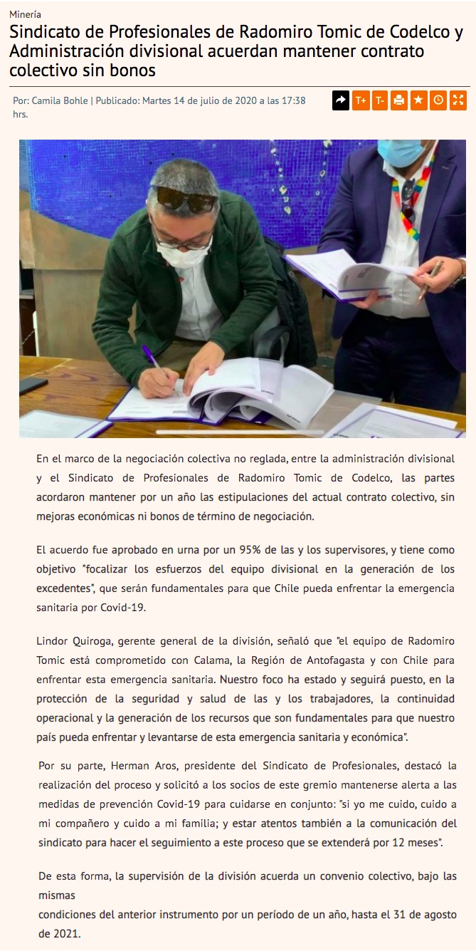 Supervisores de RT llegan a acuerdo para extender sus contratos sin recibir bonos - (El Mercurio de Calama)