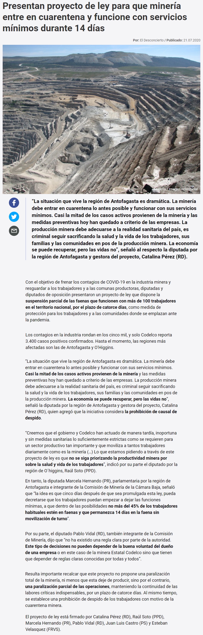 Presentan proyecto de ley para que minería entre en cuarentena - (El Mercurio de Antofagasta)