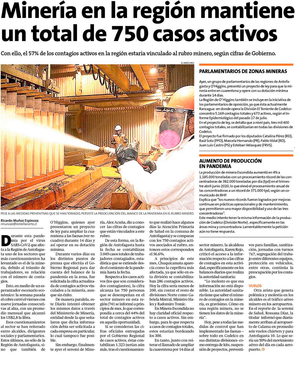 Casos activos de covid ligados a la minería en la región suman 750 - (El Mercurio de Antofagasta)