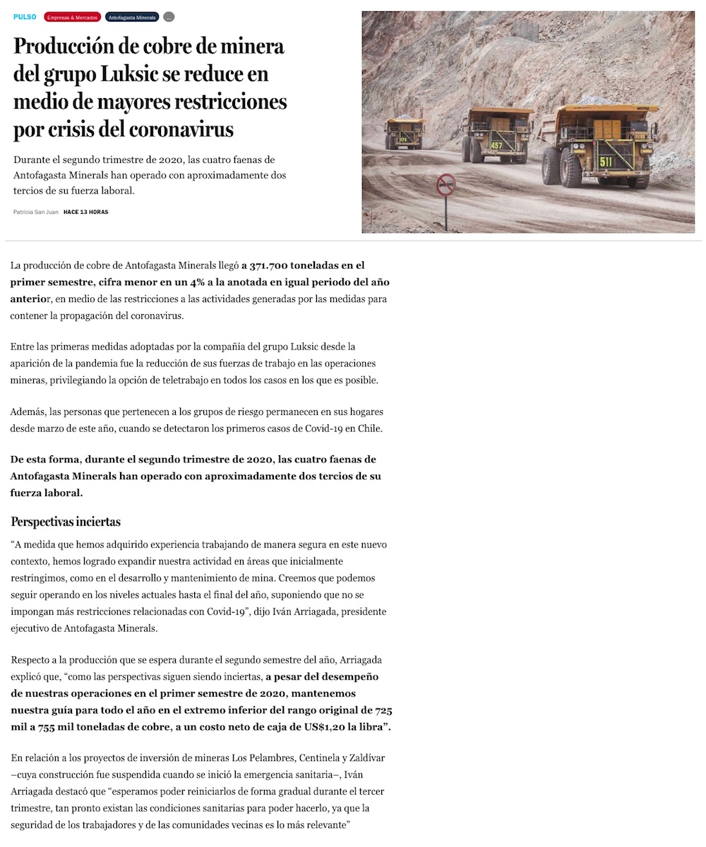 Minera de Luksic baja su producción a causa del coronavirus, pero mantiene sus proyecciones para el año - (DF Online)