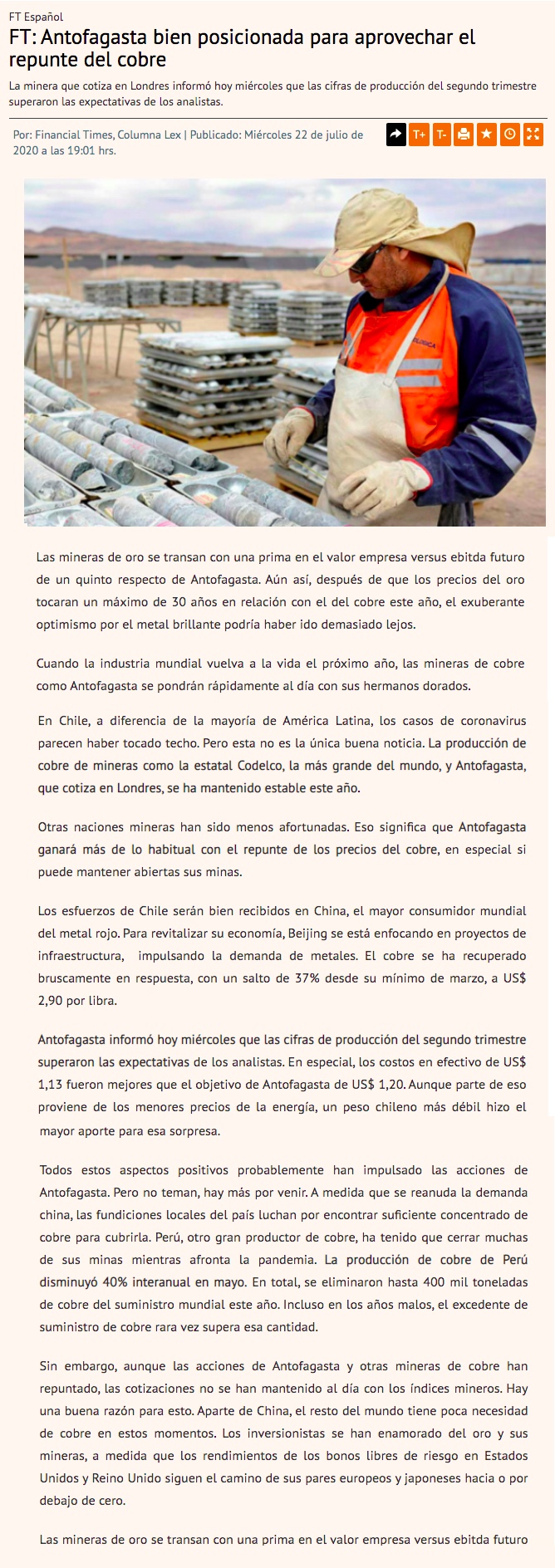 Chilena Antofagasta mantiene meta de producción de cobre para el 2020 pese a caída trimestral - (Gestión Online (Perú))