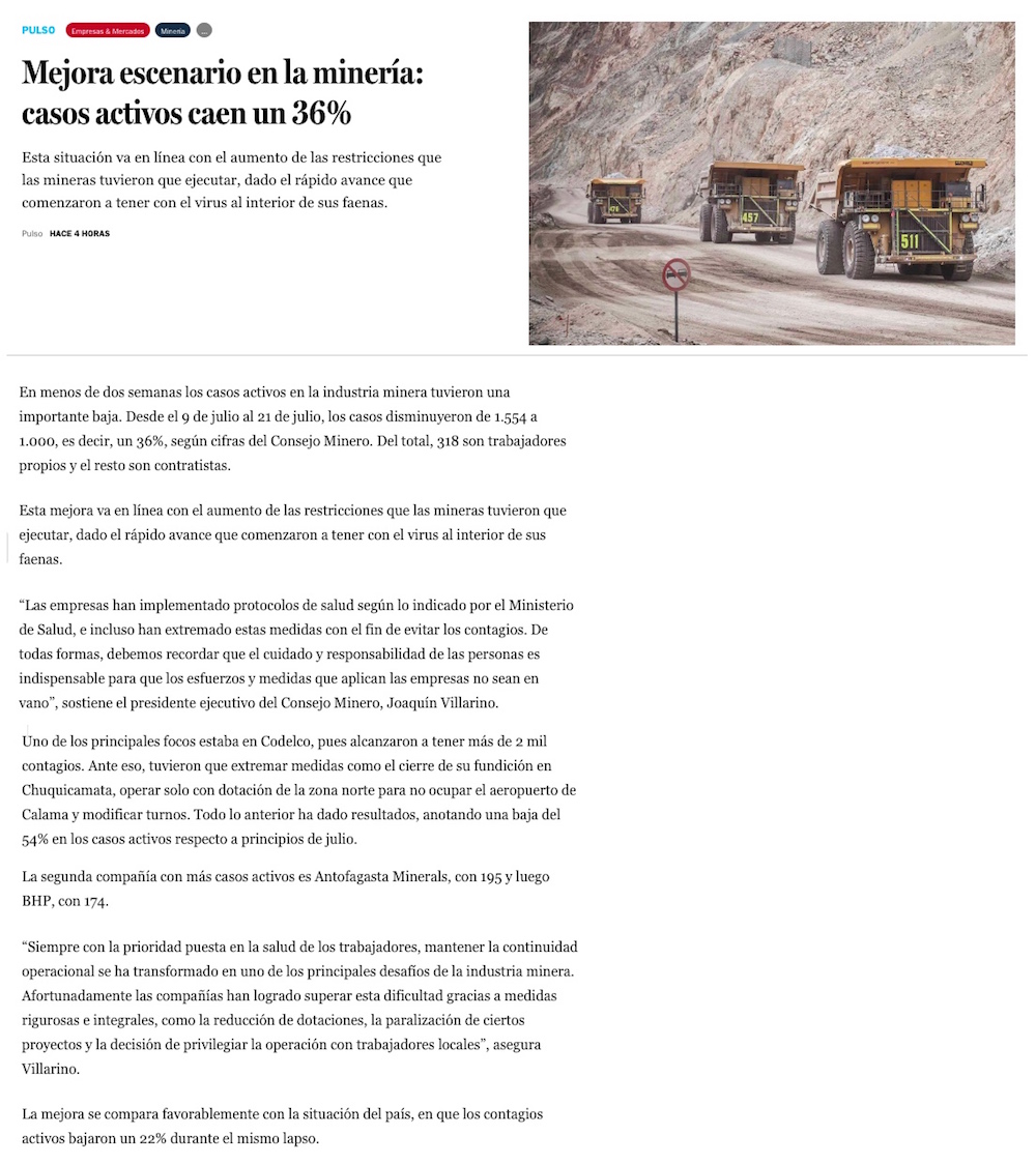 Mejora escenario en la minería casos activos caen un 36% - (Pulso)
