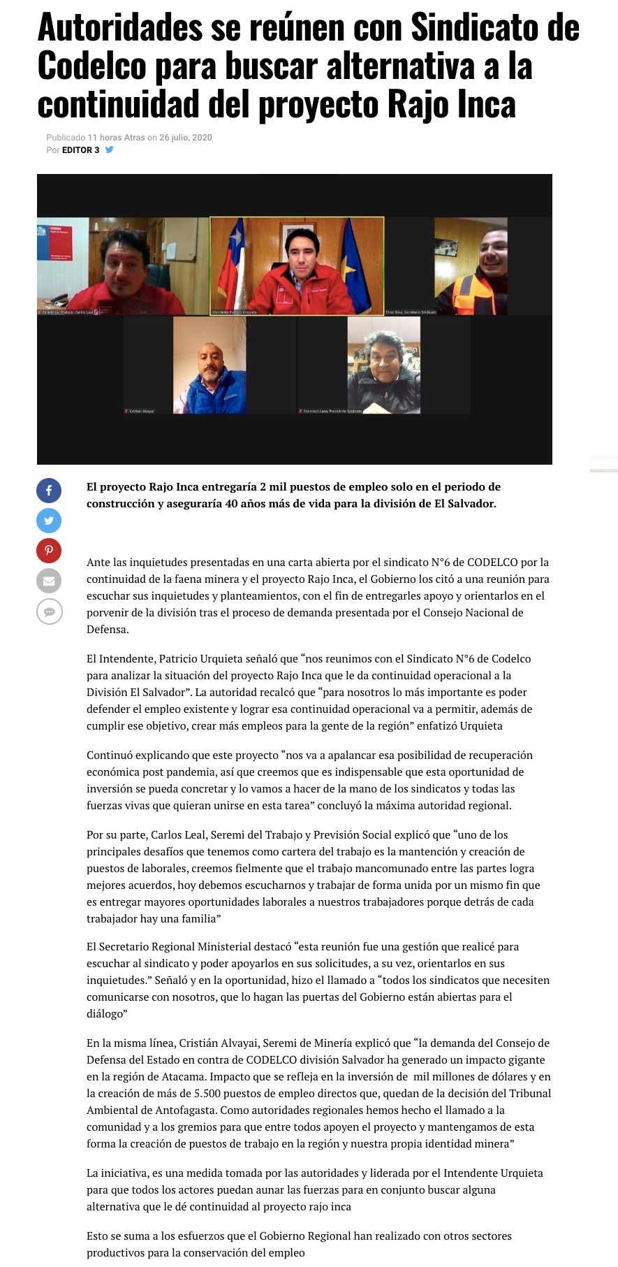 Prokurica se reúne con presidente ejecutivo de Codelco por Rajo Inca - (El Diario de Atacama)