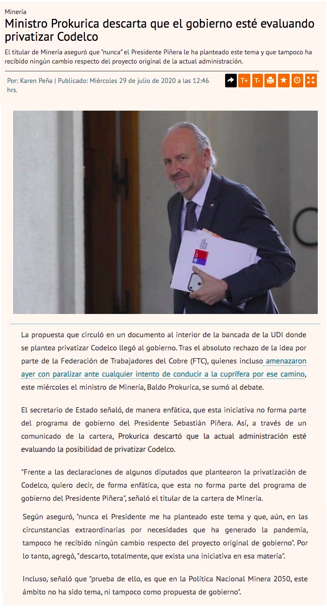Ministro Prokurica descarta posibilidad de privatizar Codelco - (laNacion)