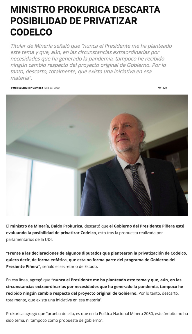 Ministro Prokurica descarta que el gobierno esté evaluando privatizar Codelco - (DF Online)
