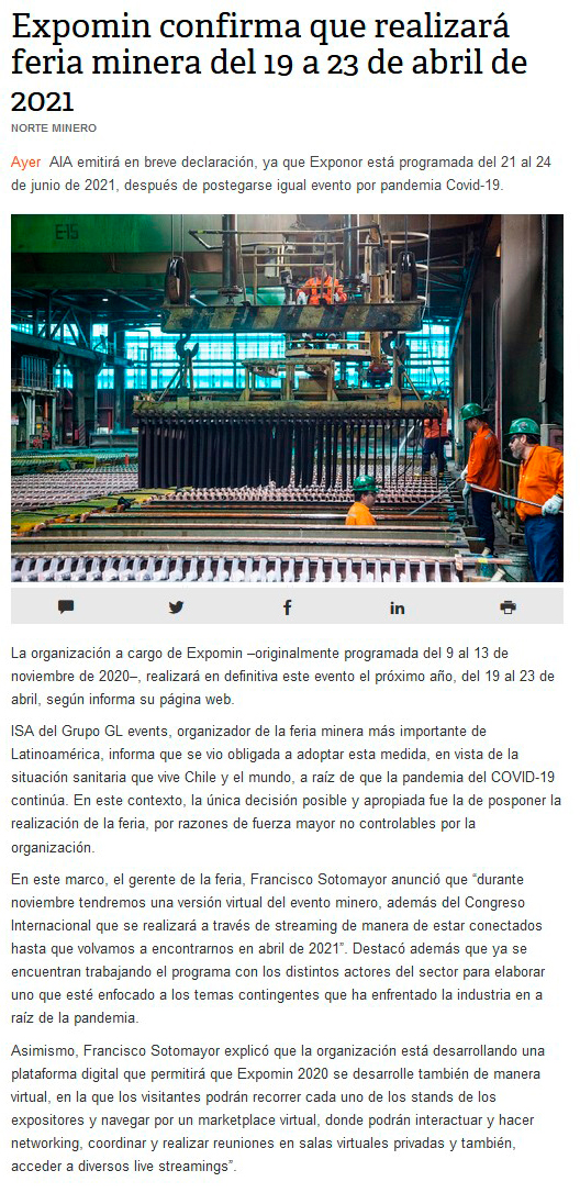 Organización de Expomin posterga el evento para 2021 - (reporteminero)