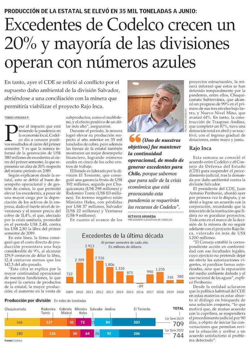 Codelco genera US$ 380 millones en excedentes - (La Segunda)
