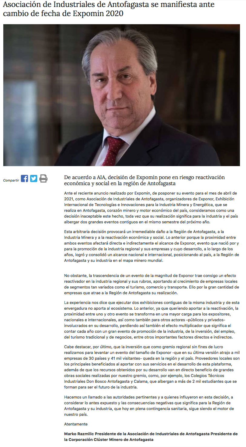 Asociación de Industriales de Antofagasta emite dura declaración por cambio de Expomin para abril de 2021 - (norteminero online)