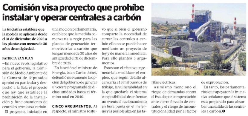 Comisión aprueba proyecto que prohíbe termoeléctricas a 2025 - (El Mercurio de Santiago)