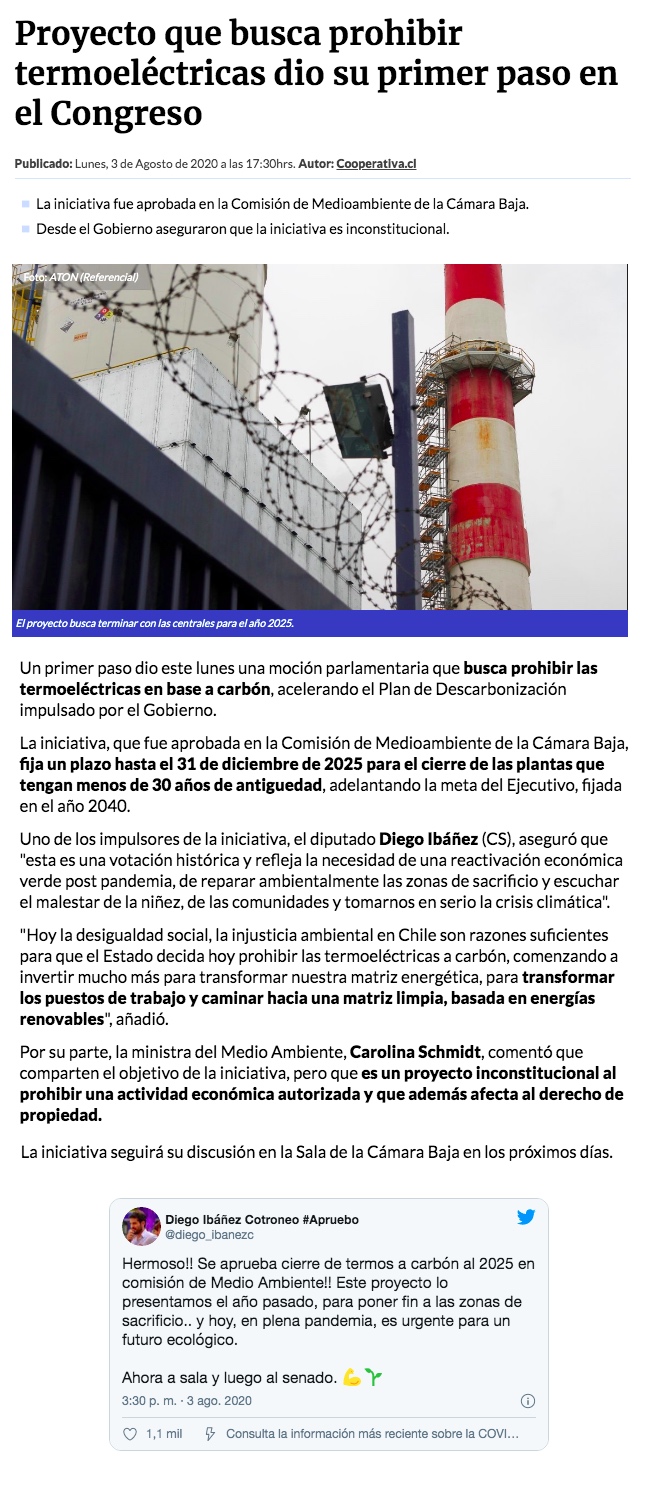 Comisión aprueba proyecto que prohíbe termoeléctricas a 2025 - (El Mercurio de Santiago)