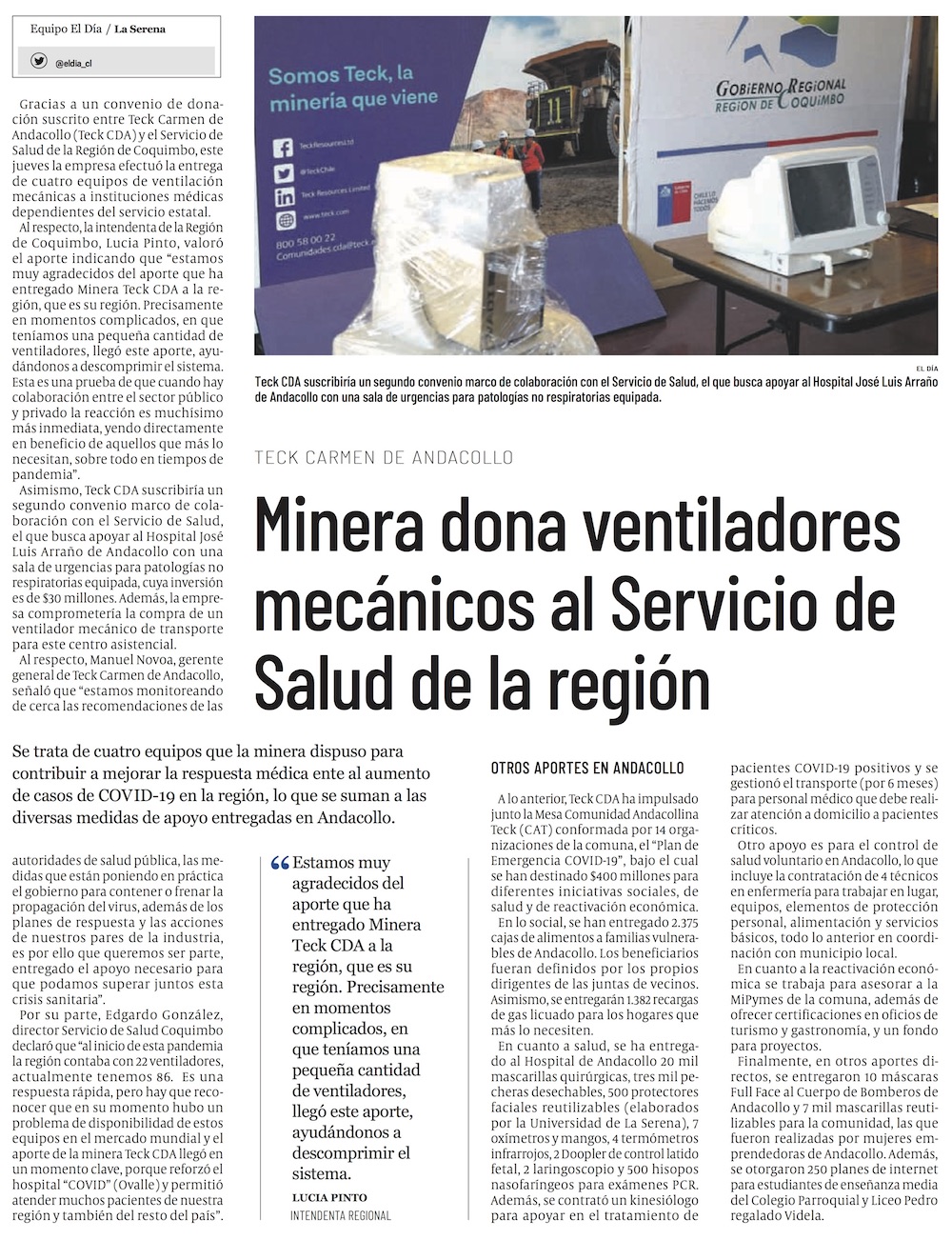 Teck Carmen de Andacollo dona ventiladores mecánicos al Servicio de Salud de la Región de Coquimbo - (La Región)