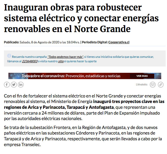 Inauguran obras que robustecen el sistema eléctrico en el Norte Grande - (El Mercurio de Antofagasta)