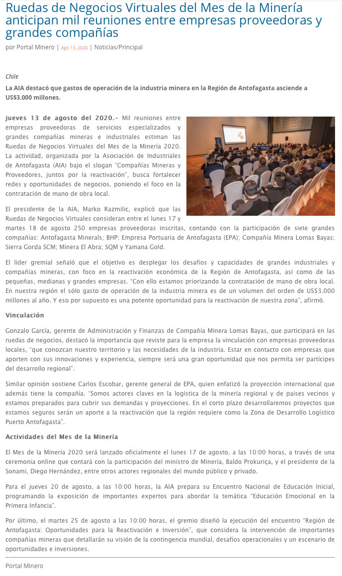 Ruedas de Negocios Virtuales de AIA por el Mes de la Minería anticipan mil reuniones - (mch.cl)