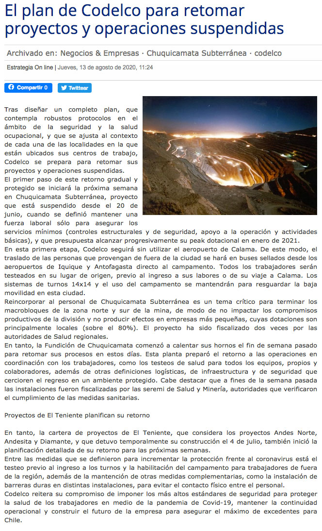 Codelco reduce fuertemente contagios y ya piensa en planes de egreso para trabajadores - (El Mercurio de Santiago)