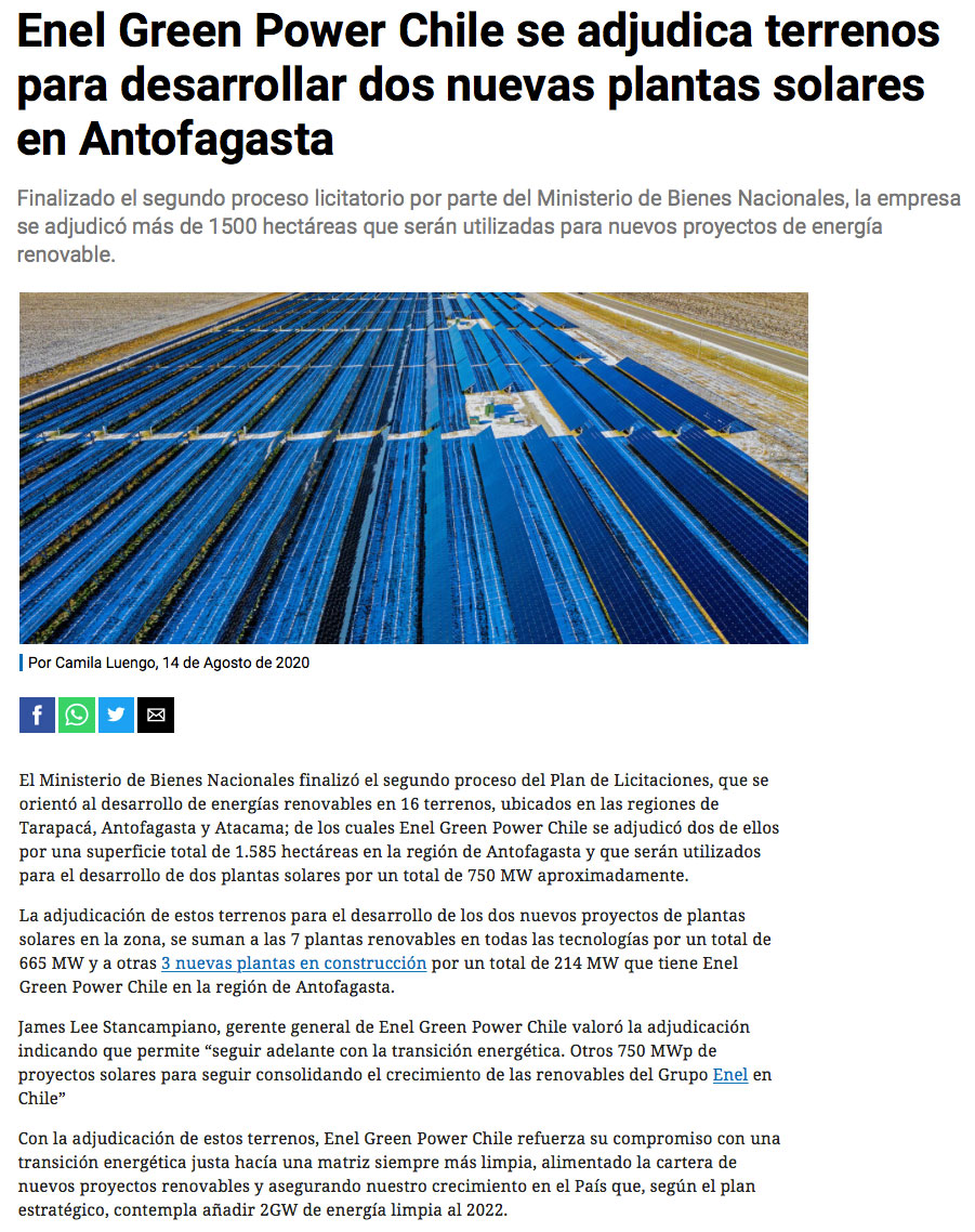 Enel se adjudicó terreno para desarrollar una planta de energía solar en Taltal - (El Mercurio de Calama)