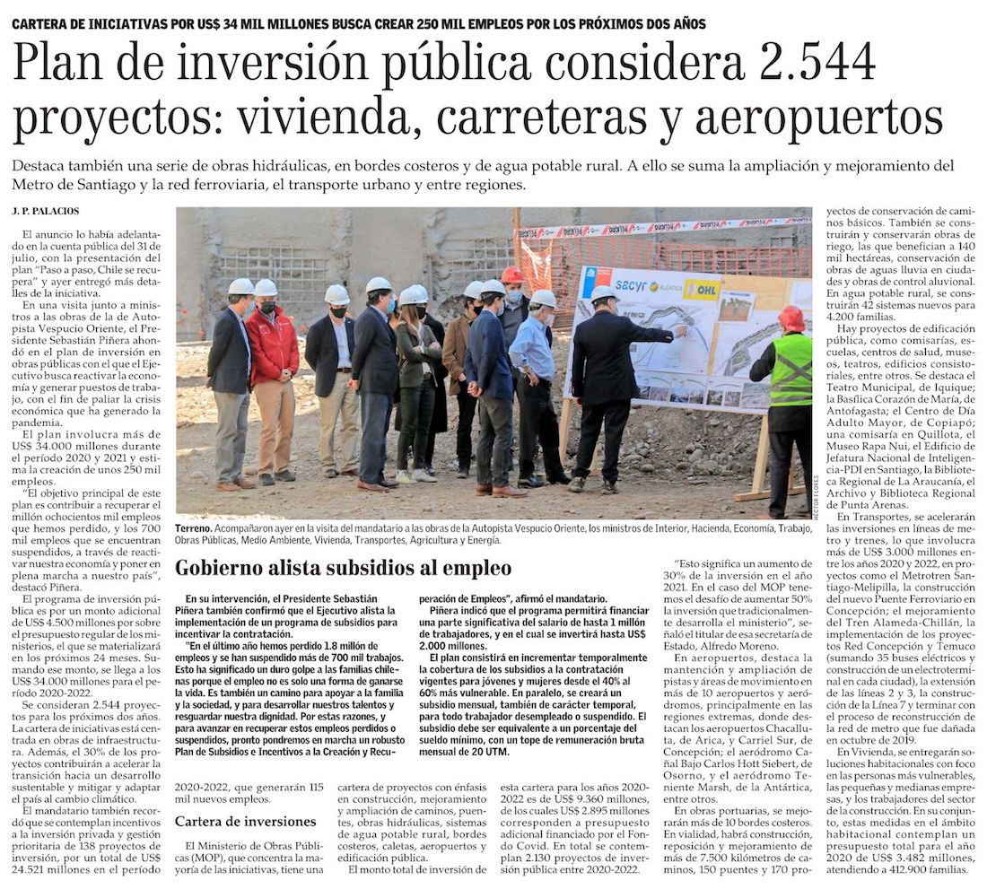 Piñera anuncia plan de inversión pública por US$ 34 mil millones - (Diario Financiero)