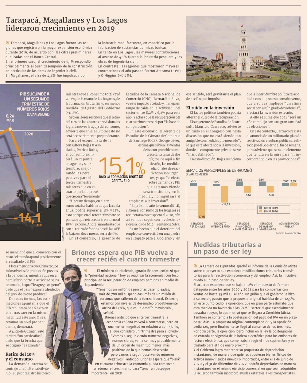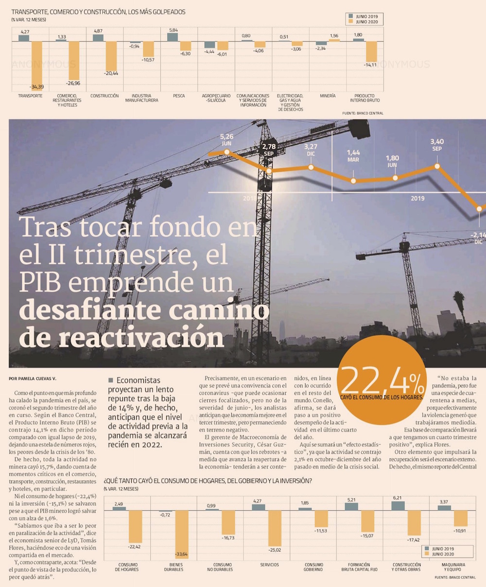 Economía cae inédito 14,1% en 2º trimestre y PIB retrocede a niveles de hace seis años - (El Mercurio de Santiago)