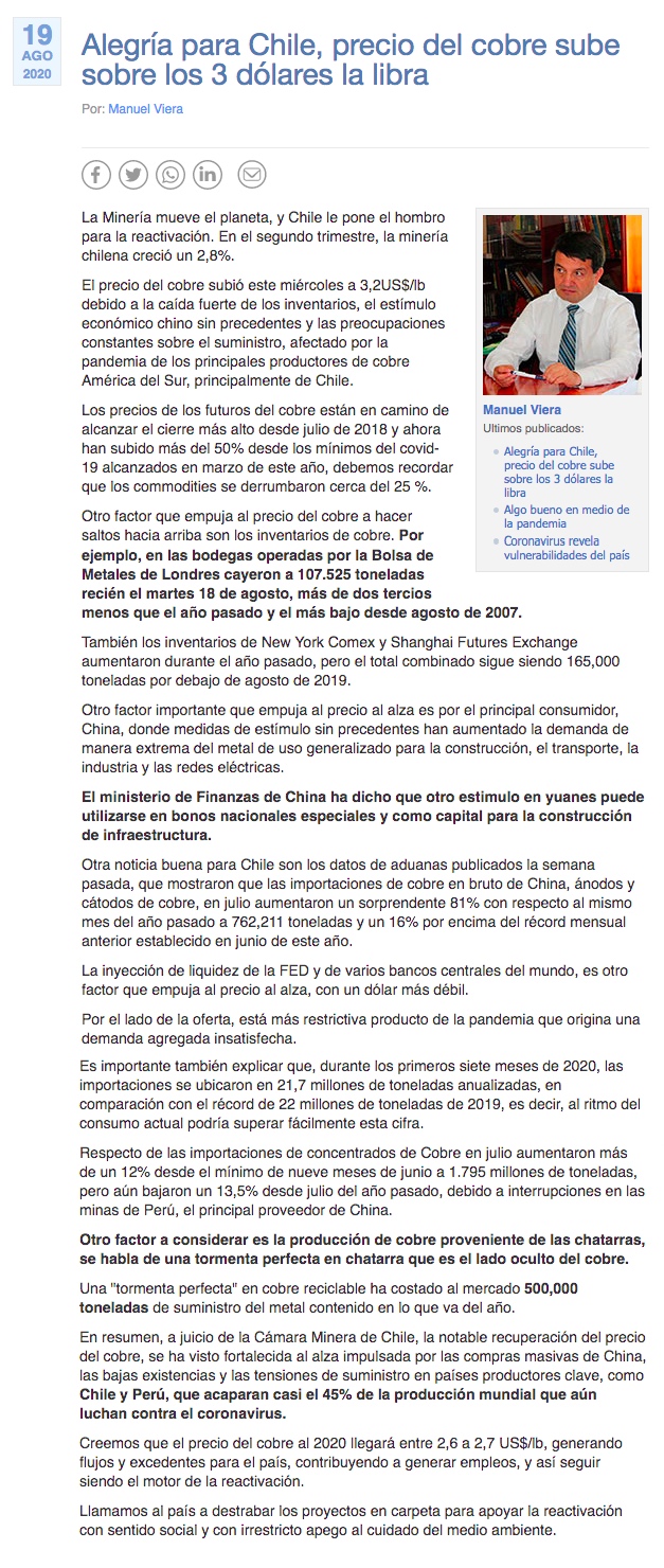 Mejores perspectivas y bajos inventarios llevan a la libra de cobre sobre la barrera de los US$ 3 - (El Mercurio de Calama)