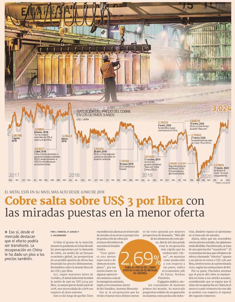 Mejores perspectivas y bajos inventarios llevan a la libra de cobre sobre la barrera de los US$ 3 - (El Mercurio de Calama)
