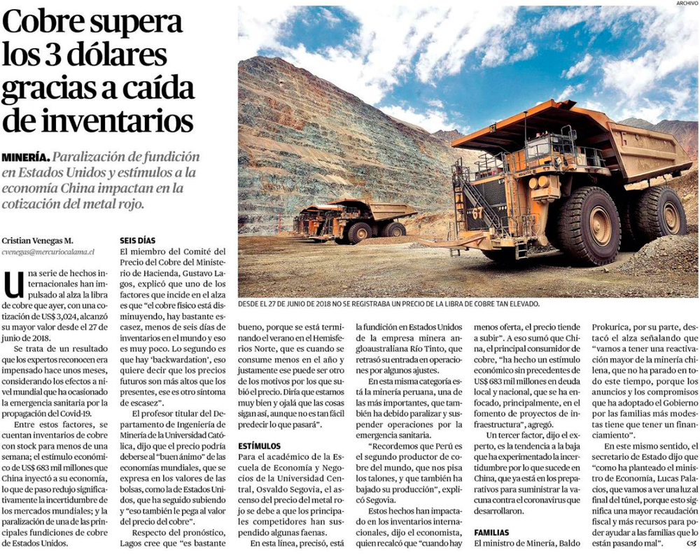 Mejores perspectivas y bajos inventarios llevan a la libra de cobre sobre la barrera de los US$ 3 - (El Mercurio de Calama)