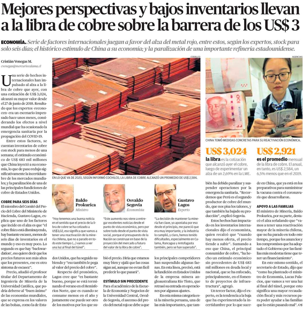 Menor oferta lleva al cobre sobre los US$ 3 y fisco recibiría hasta US$ 1.000 mills. adicionales - (El Mercurio de Santiago)
