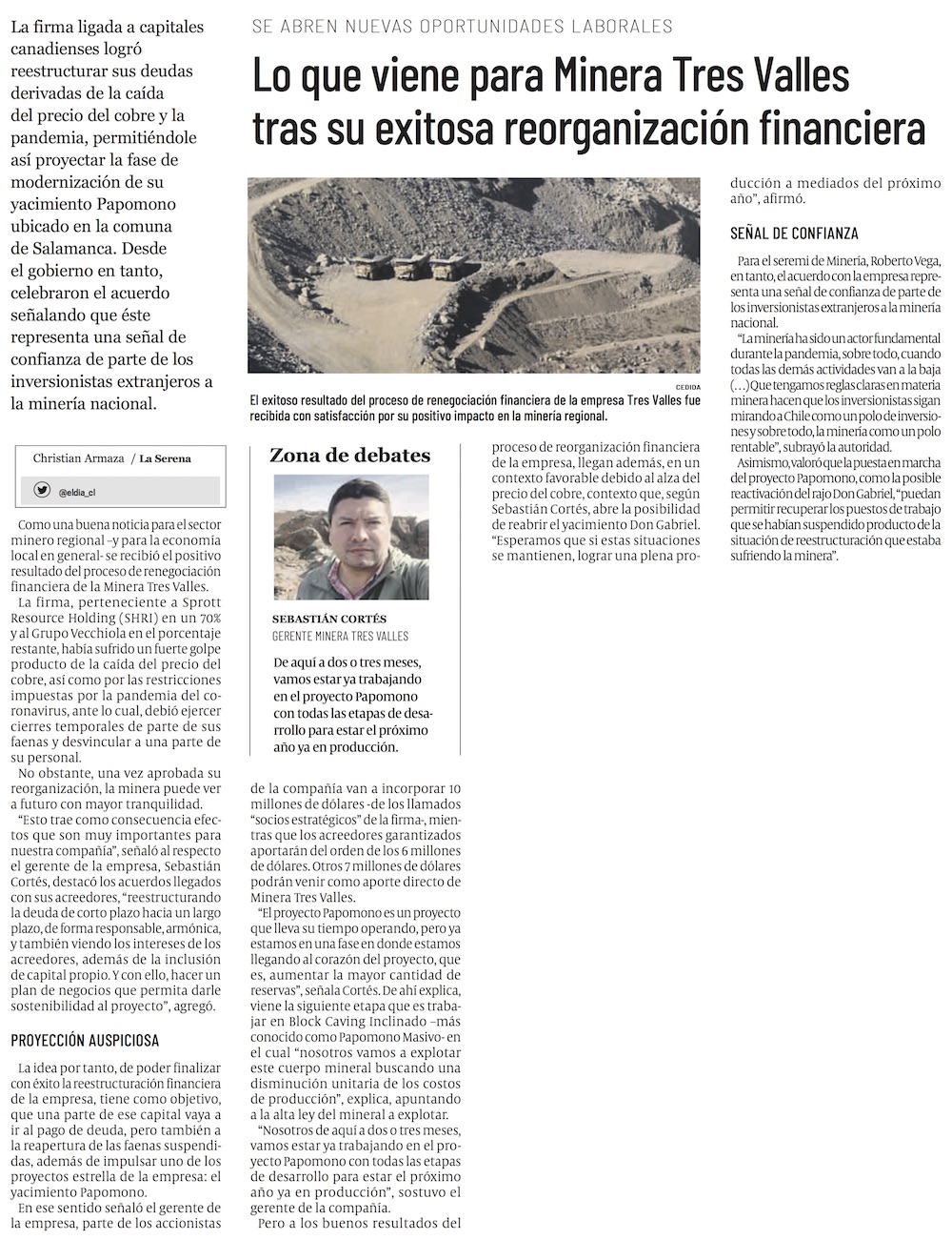 Minera Tres Valles logra aprobar proceso de reestructuración de sus pasivos con el apoyo mayoritario de sus acreedores - (DF Online)