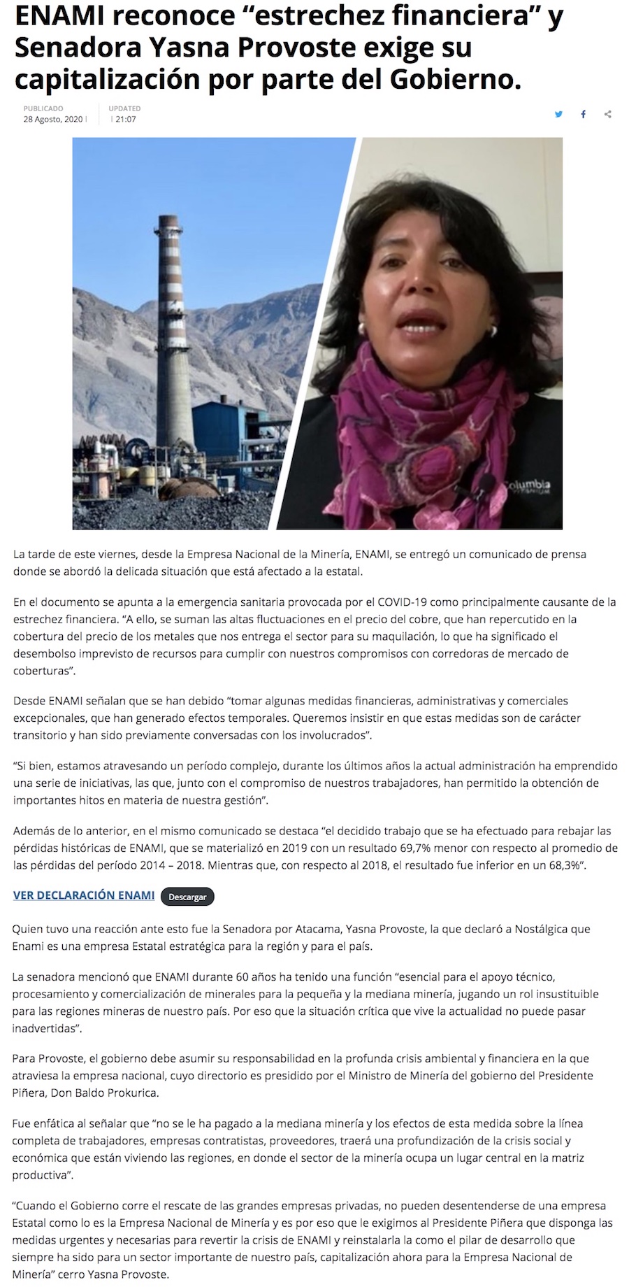 ENAMI se refiere a los efectos de la pandemia en la empresa - (El Chañarcillo)