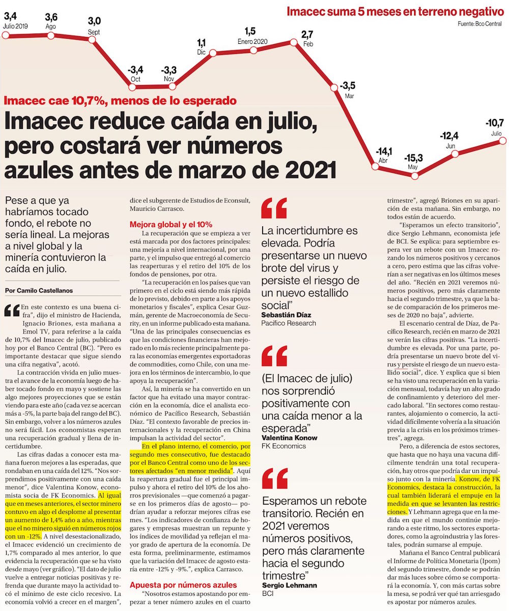 Economía se anima con el rebote: cae menos de lo esperado en julio y en agosto la baja sería de un dígito - (Diario Financiero)