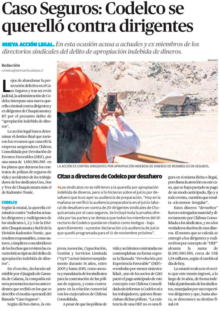 Codelco presenta querella contra actuales y exdirigentes sindicales - (Pulso)
