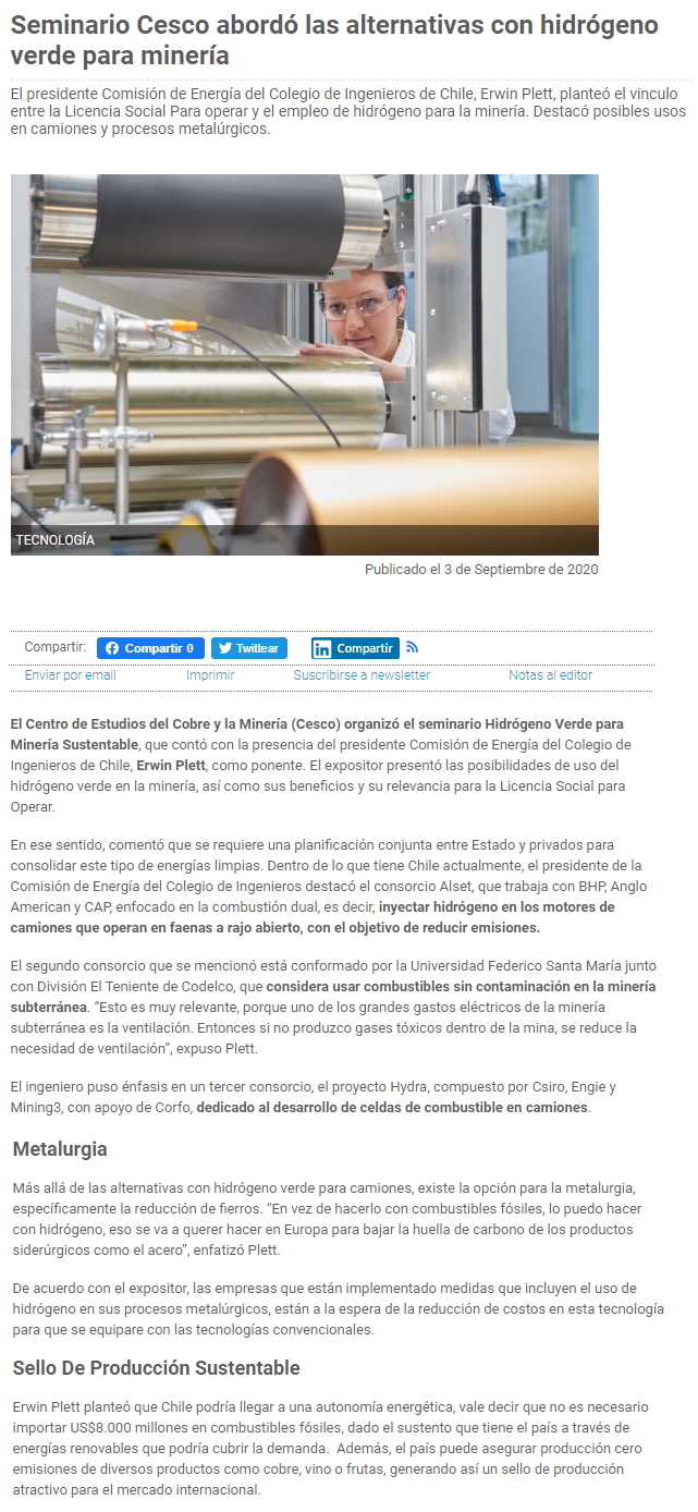 Seminario Cesco abordó las alternativas con hidrógeno verde para minería - (mch.cl)