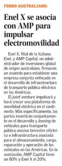 Enel X y AMP Capital sellan alianza para promover transporte público eléctrico - (Diario Financiero)