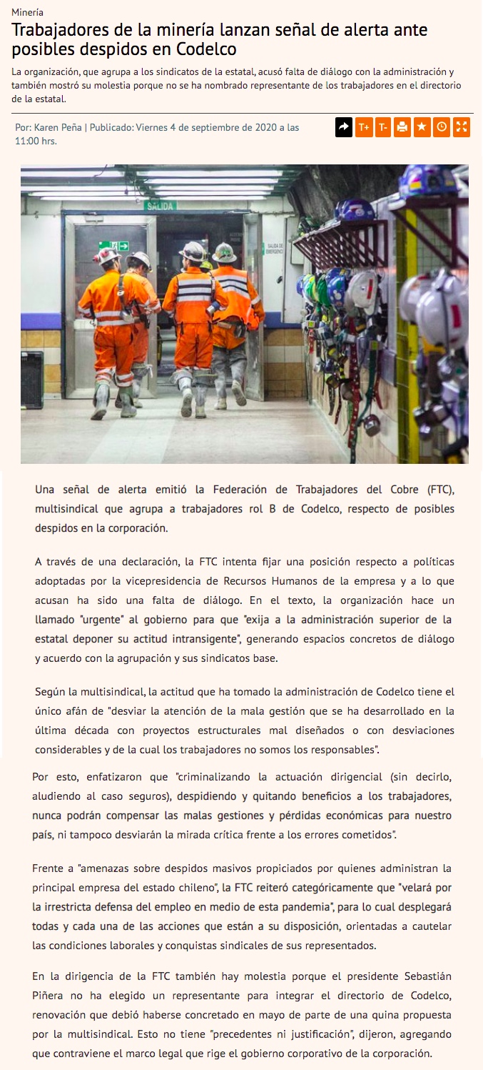 FTC pone voz de alerta frente a amenazas de desvinculaciones masivas en Codelco - (El Mercurio de Calama)