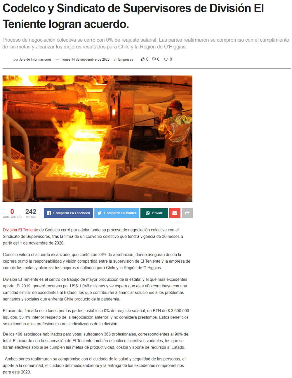 Codelco y Sindicato de Supervisores de División El Teniente logran acuerdo - (nuevaminería online)