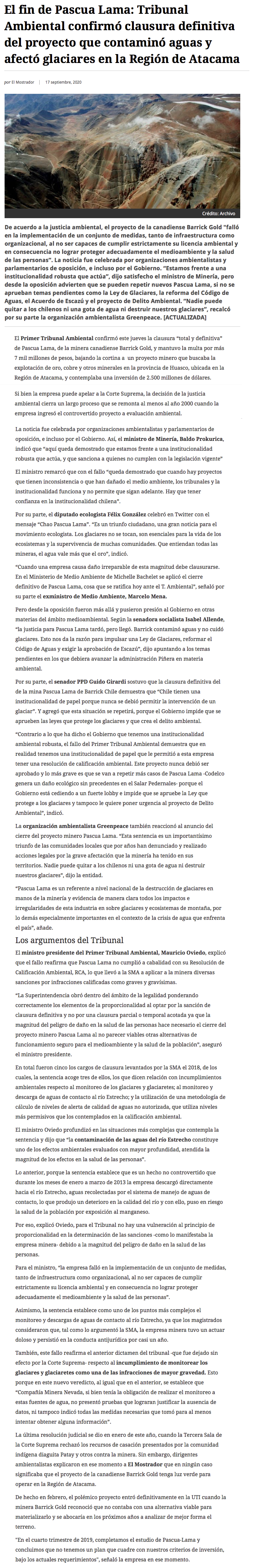 Tribunal ambiental clausura Pascua Lama definitivamente - (El Mercurio de Antofagasta)