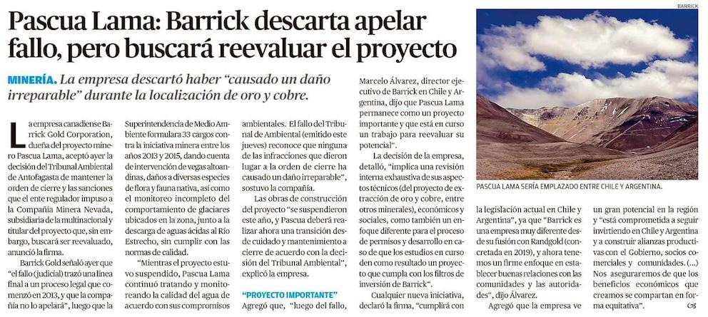 Barrick descartó apelar al fallo del Tribunal Ambiental por Pascua Lama - (Pulso)