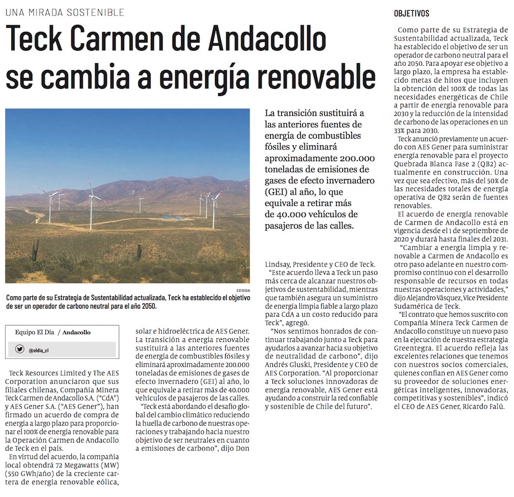 Teck y AES Gener firman acuerdo de compra de energía renovable para abastecer operación de Carmen de Andacollo - (DF Online)