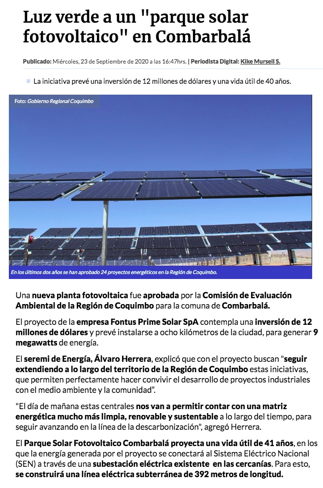 Aprueban un nuevo proyecto fotovoltaico para Combarbalá - (El Día)