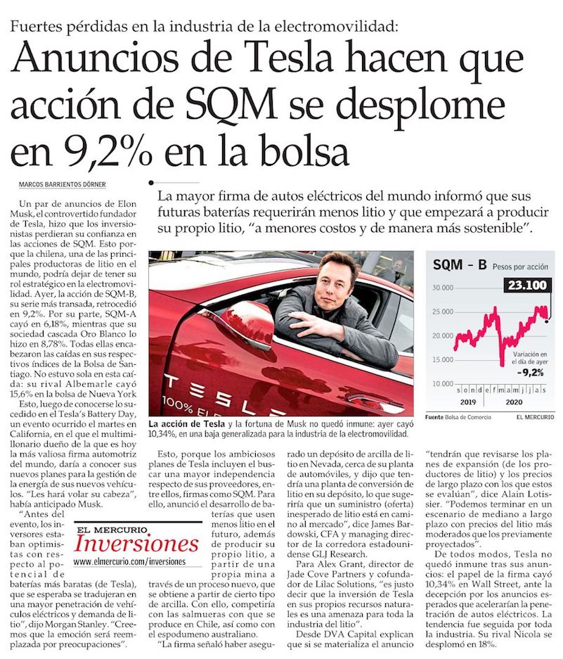 Acciones de SQM caen casi 10% tras anuncios realizados por Tesla - (El Mercurio de Antofagasta)