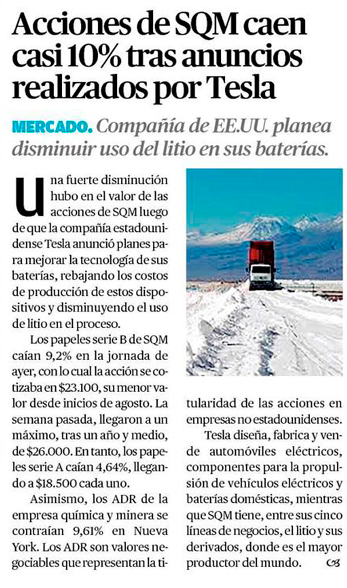 Anuncios de Tesla hacen que acción de SQM se desplome en 9,2% en la bolsa - (El Mercurio de Santiago)