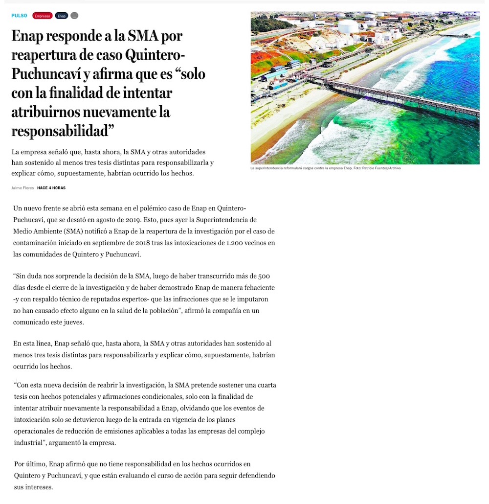 ENAP acusa que SMA reabrió caso Quintero-Puchuncaví "sólo con el fin de intentar atribuirnos nuevamente la responsabilidad" - (emol)