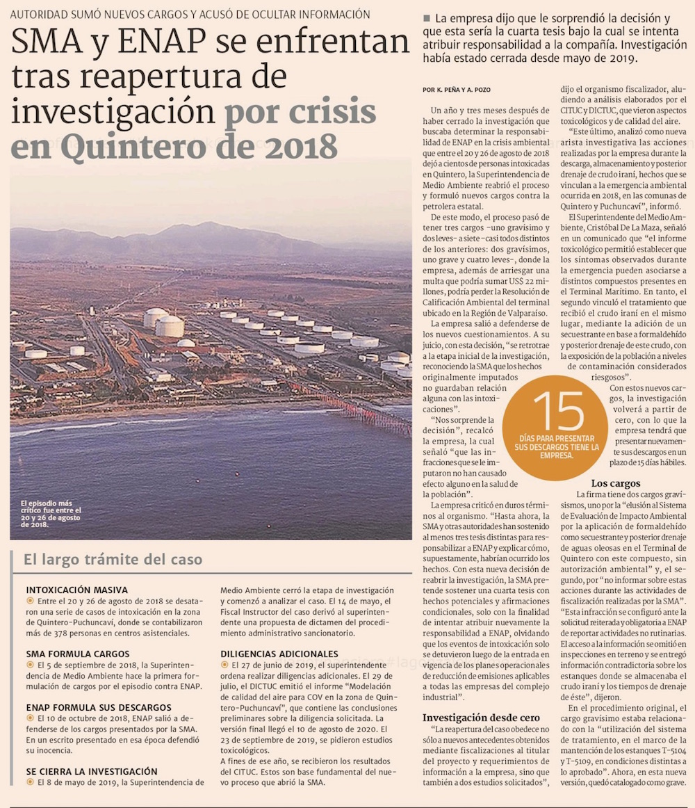 SMA reformula cargos en contra de Enap en Quintero - (El Mercurio de Santiago)
