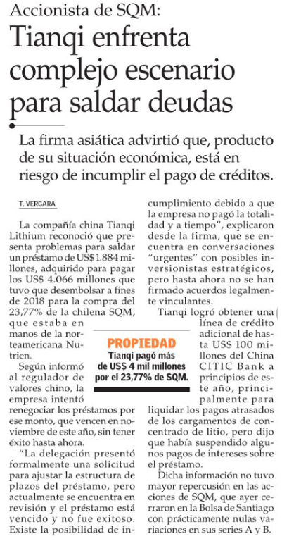 Tianqi Lithium avisa que está al borde de incumplimiento del pago del préstamo obtenido para comprar parte de SQM - (El Mostrador)