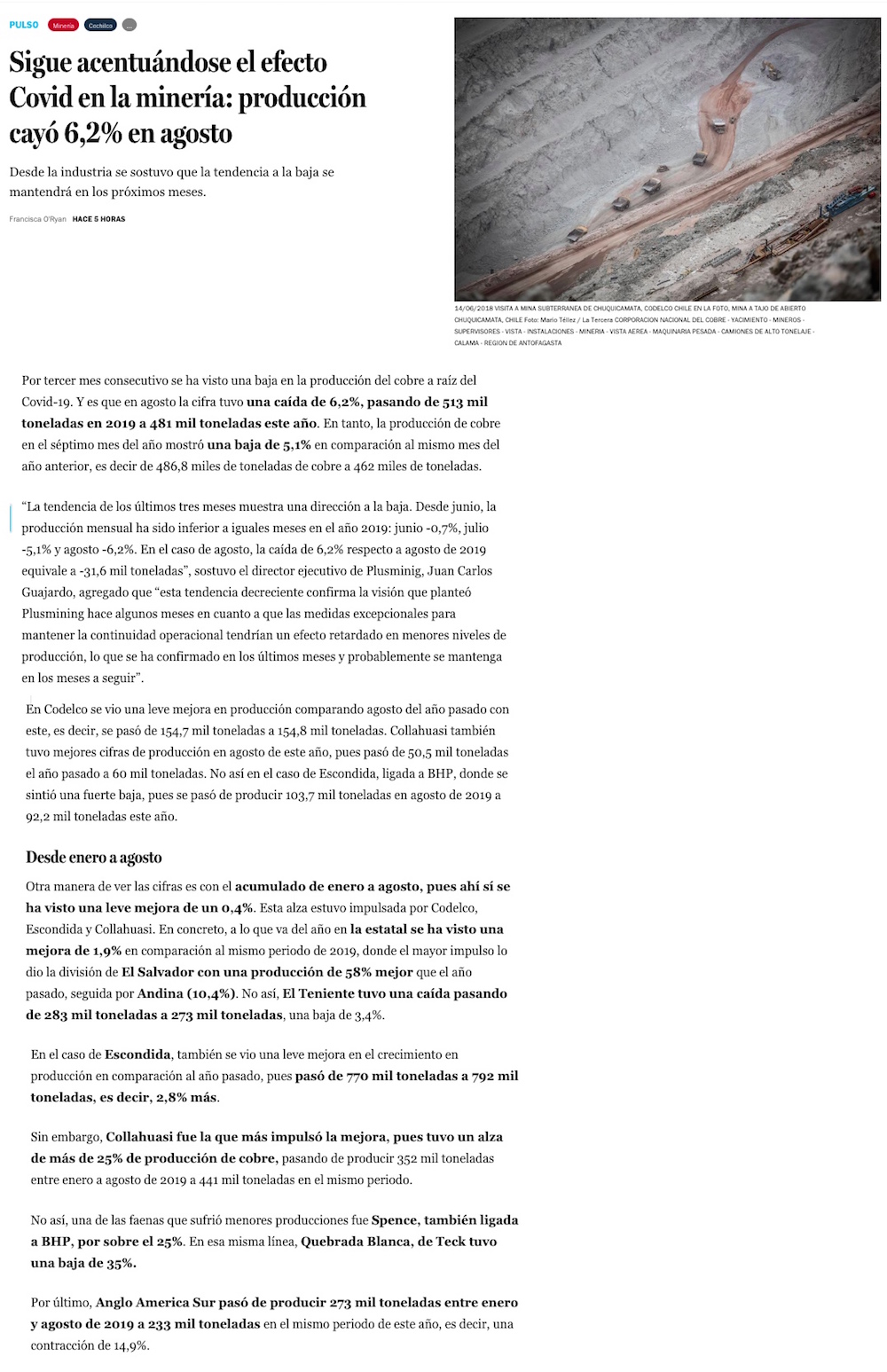 Producción de cobre cae 6,2% y confirma tendencia a la baja - (El Mercurio de Santiago)