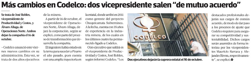 Codelco anuncia salida de dos de sus vicepresidentes - (El Mercurio de Santiago)